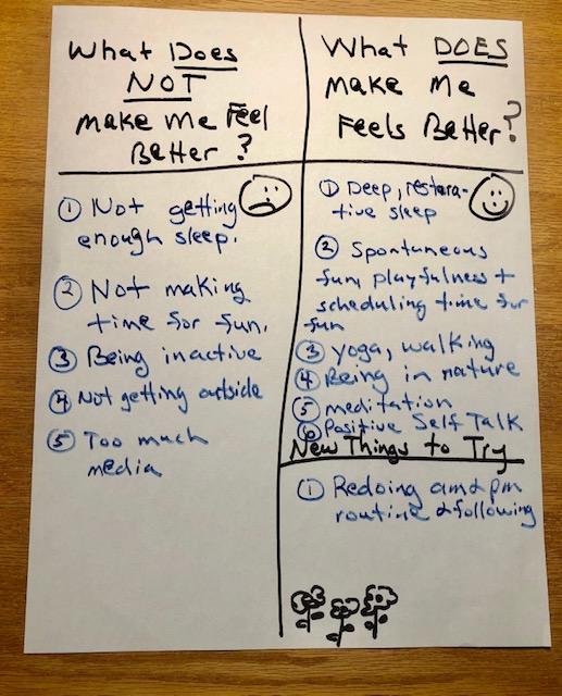 4. Put this visual FEEL BETTER PLAN up on your frig or on your mirror, etc. as a reference to go to when you needing some concrete ideas. Many times when we are upset it is hard to think clearly, thus a solid plan to look back at when needed.